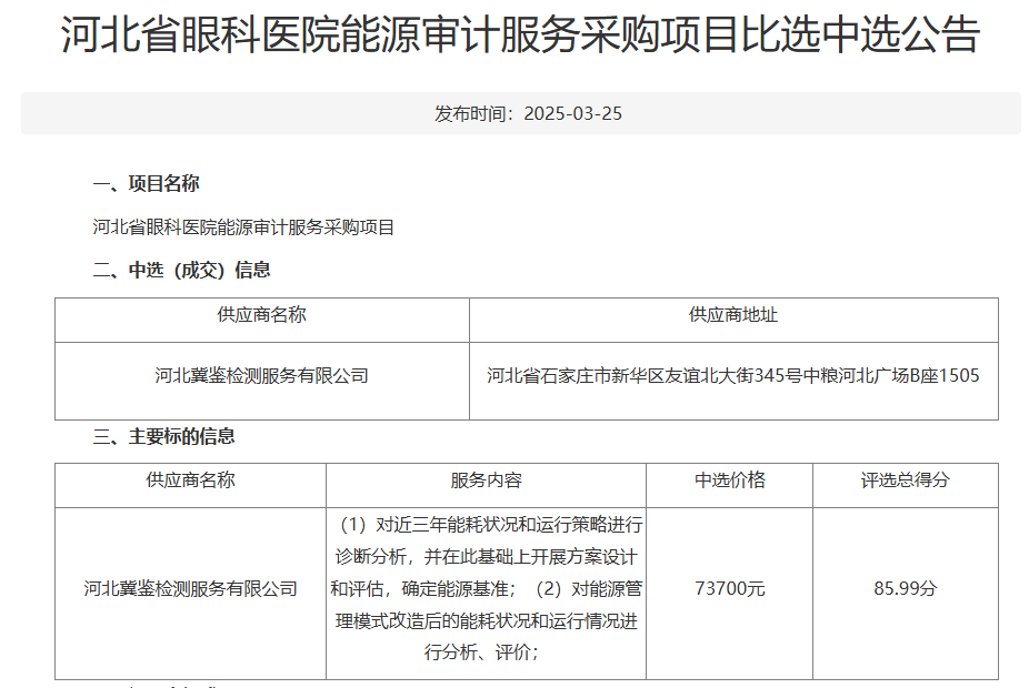 中標(biāo)喜報憑借良好的信譽(yù)、行業(yè)經(jīng)驗(yàn)、堅(jiān)實(shí)的技術(shù)能力及優(yōu)秀的方案,我公司最終順利中標(biāo)“河北省眼科醫(yī)院能源審計(jì)服務(wù)采購項(xiàng)目”。 風(fēng)起云涌新時代,破浪前行正當(dāng)時。河北冀鑒檢測服務(wù)有限公司將緊抓機(jī)遇,迎接挑戰(zhàn),不斷提升審計(jì)服務(wù)水平。查看詳情>>